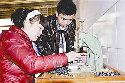 3月11日,湖北恩施市红土乡红土溪村返乡农民工朱圣平正在教“工人”加工耳机零配件。