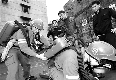 打开呼吸器盖子,关氧气,下气瓶,换上新瓶,开氧气,合上盖子——3月12日上午,重庆能源集团逢春煤矿救护队员李克中(左一)做完给呼吸器更换氧气瓶的6个动作仅用了19.57秒!而该项目的全国纪录为20秒。去年,李克中曾用25秒的速度完成,为此他成了矿上的救护“全能标兵”。上个月他说要冲刺全国纪录,在徒弟张小平的配合下,李克中每天多练1小时,这不,被队友们认为是不可能完成的20秒,终于被他拿下了。张登泽 摄