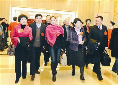 朱雪芹(左三)和代表们一同步入会场。本报记者 杨登峰摄