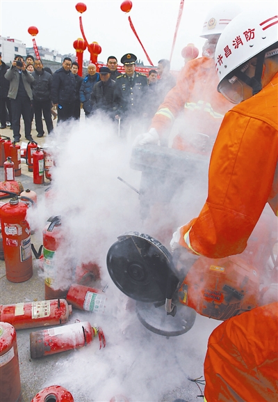 3月15日,河南省许昌市公安消防支队在春秋广场集中销毁假冒伪劣和非法消防产品,消防官兵采取切割、钻空打眼等方式将近期收缴的灭火器、防火门、应急照明灯等3个品种300余件假冒伪劣和非法消防产品公开销毁。牛书培 摄