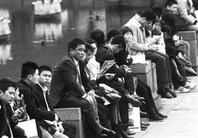 3月16日,因为咨询看房的市民不多,众多房产促销人员在会场外休息。