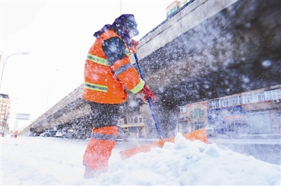 哈尔滨市15日夜至17日晨持续降雪。环卫部门出动清雪人员、车辆清理市区街路上的积雪,确保城市交通通畅和市民出行安全。