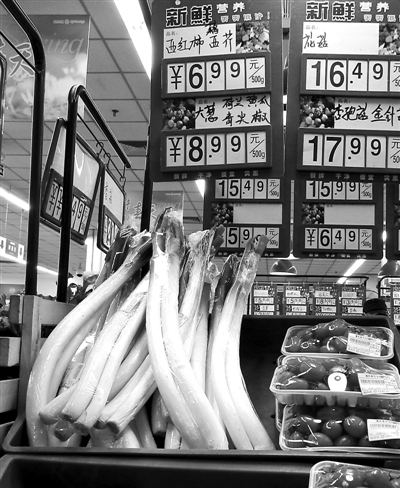 这是北京一家超市销售的大葱,标价8.99元/500克(3月15日摄)。