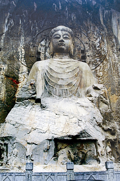 卢舍那大佛是龙门石窟中最大的佛像,总高17.14米,头高4米,耳长1.9米,足有六层楼那么高,这尊佛像,位于摩崖佛龛的后壁正中,线条自然流畅,身披通肩式袈裟,头上是螺形发髻,气度恢弘,面容丰富,妙相庄严,丰颐秀目,嘴角微翘,头部稍低,微微俯视,神态高雅,体态丰满,姿态可人,宛若一位睿智而慈祥的中年妇女,挂着千年不枯的微笑与人类对话,诉说着千年的历史云烟,令人敬而不惧。