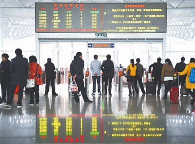 3月18日,旅客在沪宁高铁江苏常州站等候验票。上海铁路局将自3月20日零点起调整列车运行图,对沪宁、沪杭高铁列车实行日常和周末(周五至周日)两种开行模式。沪宁高铁管内高速动车组列车日常开行69对、周末开行74对,沪杭高铁管内高速动车组列车日常开行34对、周末开行37对。新华社发(王启明 摄)
