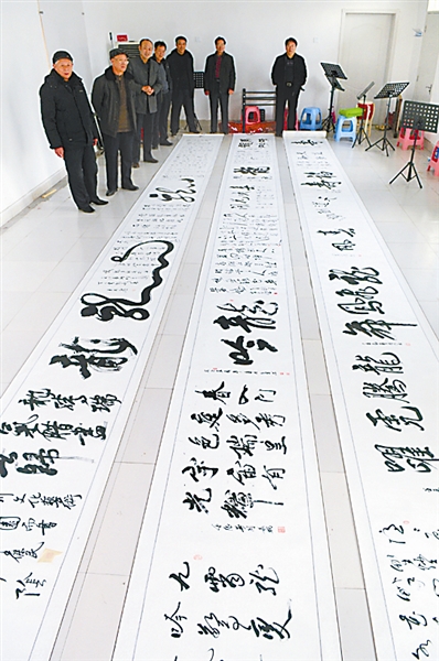 3月13日,几名市民正在欣赏百米书法长卷。日前,山东省淄博市淄川区文化艺术创意园,百名书法爱好者集体创作了百米书法长卷,用不同的字体,不同的手法,展现了“龙年文化兴”的主题。今后,淄川区文化艺术创意园将确定不同的主题进行长卷创作,形成长卷文化系列。闫盛霆 摄