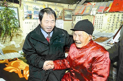2012年2月1日一早,在距离平顶山市区10多公里的五虎刘村,刘嘉老人的小茅庵院里院外都贴上了崭新的对联,10多个乡亲忙碌着,为寿宴做着准备。