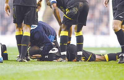 2012年3月17日,在伦敦进行的英足总杯1/4决赛热刺对博尔顿比赛中,博尔顿队球员姆万巴在没有任何身体碰撞的情况下突然倒地。CFP供图