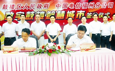 中国电信福州分公司领导与鼓楼区人民政府签订“数字鼓楼智慧城市”信息化战略合作协议。