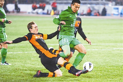 3月20日晚,2012亚冠联赛F组第2轮比赛,北京国安队主场1比1战平澳大利亚布里斯班怒吼队。图为国安队毛剑卿遭对手夹击。