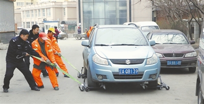 3月22日,沈阳市公安局东陵(浑南新区)分局交通管理科民警正在使用一种叫“汽车移位器”的新式武器移动停在路边的无驾驶员在场的车辆,并在空出的位置上施划停车泊位标志线。