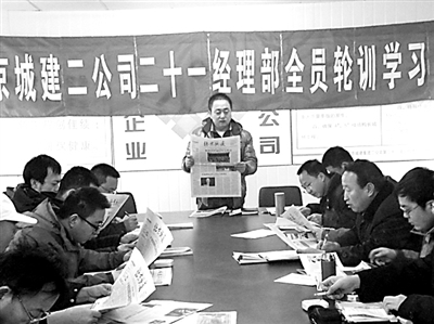 曾承建鸟巢等40多项奥运工程的北京城建集团,每年确立一个紧跟企业发展的主题,在三万员工中展开大学习、大培训活动,坚持近30年不间断。今春,该集团确立了“弘扬优秀文化、培育优良作风、促进和谐发展”的全员轮训主题,图为二公司积极响应,展开了形式多样的轮训学习活动。杨保川 摄