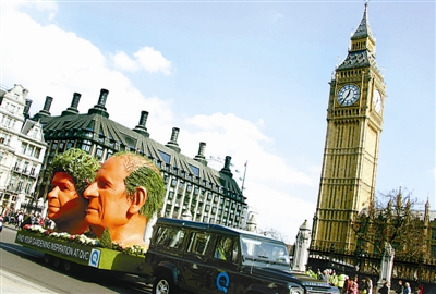 3月21日,在英国伦敦,巨大的英国女王伊丽莎白二世和丈夫菲利普亲王的头像雕塑被拖车拉着从大本钟前经过。
