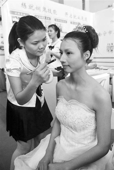 3月25日,南宁卫生学校的学生王小珍(左)展示美容化妆技能。