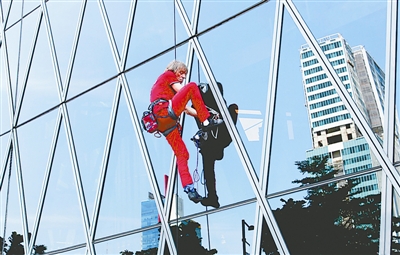 3月25日在印尼雅加达,法国蜘蛛人阿兰·罗贝尔借助绳索成功登顶巴克利塔。巴克利塔高215米,共有50层。阿健 供图