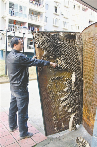 不在登记内容之列、住户反映强烈的问题还有单元门的质量。很多单元门的洞口或破损处,均可以看见内部翘起的纸壳。同样令人震惊的是,窨井盖的内芯不是钢筋而是竹篾。东早 摄