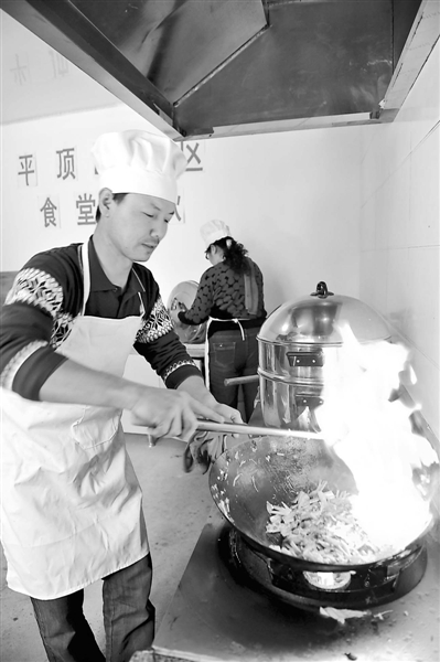 3月29日,在乌鲁木齐市沙依巴克区平顶山社区的社区食堂里,一位厨师在炒菜。