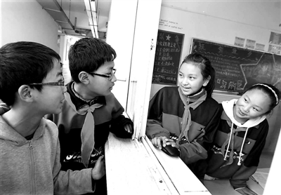 3月28日,来自西藏日喀则地区的丹增潘多(右二)、来自拉萨的格桑晋扎(左二)和同学们在课间休息时聊天。