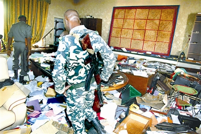 3月26日,马里军人在首都巴马科被洗劫的总统府内行走。 新华社/美联