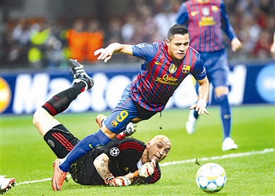 3月28日,AC米兰队门将阿比亚蒂(下)在比赛中封堵巴塞罗那队球员桑切斯的进攻。当日,在欧洲足球冠军联赛四分之一决赛首回合比赛中,AC米兰队主场以0比0战平巴塞罗那队。新华社发(阿尔贝托·林格里亚摄)