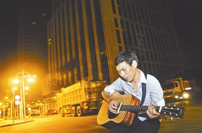 在深圳,他一直承受着各种艰辛,却始终没有放弃对音乐的热忱。晚上,他是一家银行的保安;白天,他是一名歌手。