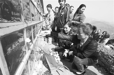 参加集体安葬仪式的市民为亲人下葬,并在墓碑前抛撒菊花瓣。