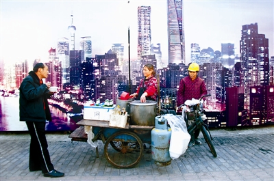 3月28日,上海浦城路,豪宅林立间一个由三轮车搭成的馄饨摊摆在某在建豪宅的江景广告牌前。热乎乎4块钱一碗的馄饨满足了附近建筑工人等外来务工人员的吃饭问题。尽管如此,摊主还是非常担心城管赶走他。王炬亮 杨深来 摄