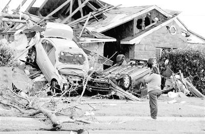 4月3日,美国中南部地区遭遇龙卷风袭击,从达拉斯至沃思堡市,龙卷风导致的损失严重。图为美国得克萨斯州,龙卷风过后,居民正在被破坏的房屋附近寻找个人物品。吉平 供图