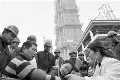 图为安徽省合肥市蜀山区西园街道一建筑工地内,社区卫生服务站的医生在给农民工测量血压。新华社记者 郭晨 摄