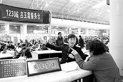 “全国巾帼文明岗”、大连火车站“吕玉霜服务台”以服务为宗旨、待旅客如亲人,十年如一日全心全意为旅客解难事、办实事,被誉为新时期的“活雷锋”。图为“吕玉霜服务台”工作人员、“全国五一劳动奖章”获得者刘晓云耐心解答旅客的问询。杨晓明 摄