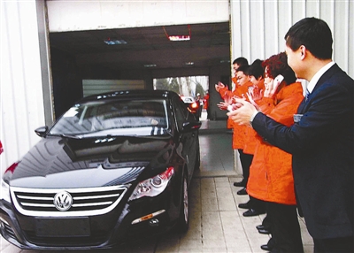 在北京一汽车4S店,一辆新车被顾客买走,办完手续后,工作人员列队鼓掌欢送。(摄于2010年12月1日)