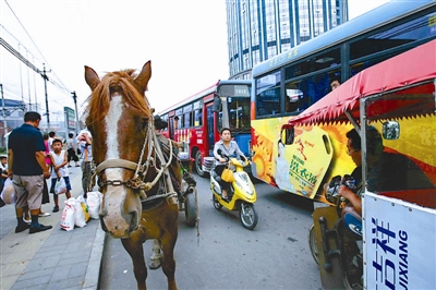 北京街头,公交车、马车、三轮车、摩托车互相抢道。 (摄于2007年8月16日)
