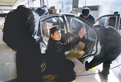 2010年底,北京实行汽车摇号限购政策前,得到消息的市民纷纷抢购。4S店的工作人员加班为车主贴膜打理。(摄于2010年12月23日)
