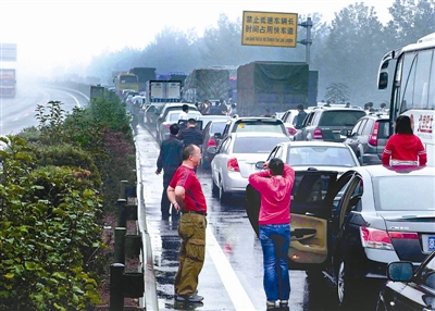 2010年国庆,京(北京)哈(哈尔滨)高速路河北段,因大雨造成十多起事故,引发严重交通拥堵。(摄于2010年10月2日)