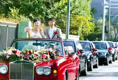 北京街头一豪华迎亲车队。用豪华车队迎接新娘子是当下年轻人婚礼常见的环节之一。(摄于2009年10月31日)