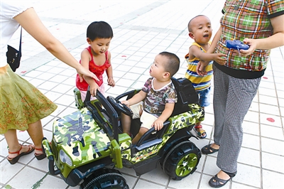 北京一小区广场,一位小朋友开着近千元的玩具车引来周围小朋友的围观,一个要争方向盘、一个要夺遥控器。 (摄于2011年7月8日)