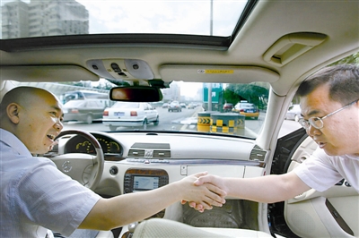 有着“顺风车王”之称的北京商人王永(图左)在自己的奔驰轿车里与客人握手告别。14年来,他一直坚持免费提供搭乘服务,载客超过1万人。(摄于2010年7月20日)