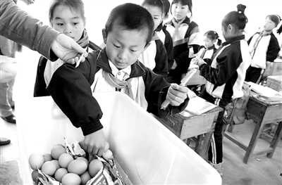 自2012年春季学期起,安徽省金寨、临泉、阜南、宿松等12个县的近140万名农村义务教育学生开始享受国家实施的营养改善计划试点待遇。由于部分农村学校没有食堂或食堂现有供餐能力不足,多数学校选择以提供蛋、奶、水果等作为加餐或课间餐。 新华社记者 刘军喜摄