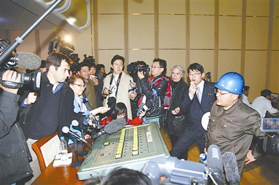 4月8日,在朝鲜平安北道铁山郡东昌里的“西海卫星发射场”监控中心,“西海卫星发射场”总负责人张明进(戴蓝盔者)向记者介绍情况。新华社记者 张利 摄