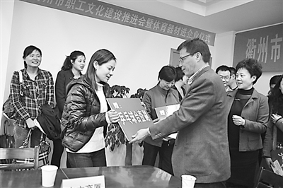 日前,浙江省衢州市总工会常务副主席应雄、副主席蒋建平为该市20家企业赠送了乒乓球台。近年来,该市总致力于职工文化建设,制定企业职工文化建设5年规划,市总工会每年拿出一定资金购买体育器材奖励职工文体活动做得好的基层工会。毛朝阳 许琳 摄