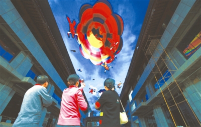 4月9日,西安大雁塔景区,几位市民拍摄高悬在走廊上空的巨型LED显示屏播放的画面,他们说太震撼了。仰望空中,一个巨大的穹顶天幕上,海底世界、太空遨游……不断变换的绚丽美景令人震撼,该屏长171米,宽17米,面积近3000平方米,造价达6000万元,目前正在调试中,将于下月启幕。 王警 摄