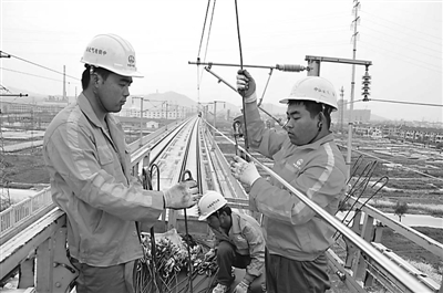 4月8日,中铁电气化局集团一公司建设者在杭甬客专杭州南至柯桥区间的柯桥特大桥上架设接触网导线。目前杭甬客专建设已进入冲刺阶段。预计今年8月开展联调联试,年底前通车运营。李朝臻 摄