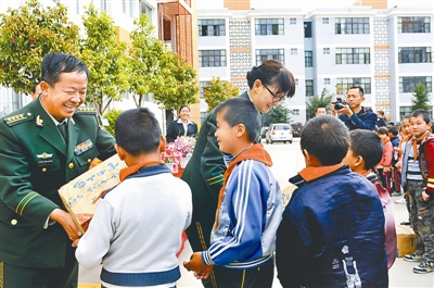 面对云南省日益加重的旱情,昆明消防指挥学校3000余名官兵自愿捐款累计20余万元,为旱区群众送去饮用水2万余箱。图为学校官兵为干旱重灾区石林小学的学生送去饮用水。韩国强 摄