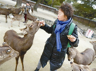 我们计划游奈良的主要景点是奈良公园和园内的大东寺。公园很大,游人不多,幽静、古朴,满园的小鹿追着游人要“鹿饼干”吃。
