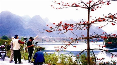 大化红水河百里画廊,木棉挺拔花更红。这里地处亚热带,气候温湿,雨量充沛,土壤肥沃,很适宜木棉树的繁殖与生长,处处都见到粗壮挺拔的木棉树,是八桂大地盛产木棉树的集中地之一。多年来,大化县广泛宣传,提高广大干部群众保护木棉树的意识,加强对红水河两岸木棉树的管理和保护,严格查处乱砍滥伐红水河沿岸的木棉树行为,有效地保护了这一珍贵的旅游生态资源。据介绍,2000年以后,该县为了保护旅游生态资源,还组织群众人工种植木棉树。百里画廊红水河段的贡川、百马两乡每年都发动群众插植木棉树,累计新增种植2.3万枝。如今,这里的木棉树已成为繁花似锦、充满勃勃生机的诱人景色。红水河谷春来早,木棉树经历了冬天漫长的休眠后,趁着春天的大好时光,还未长叶,就一枝枝绽出花蕾,有鲜红的、橙黄的、淡红的,千朵万朵争明媚,开得热烈、灿烂。乘船游览,站在船头放眼望去,两岸丛丛翠竹之间,木棉花在蓝天中绽放,倒映在碧盈盈的春水里,看去仿佛蓝天上飘忽着一抹抹彩霞。红棉点缀了两岸的生机,红棉树上,百花争艳,众鸟啾啾,衬出了河水的明丽,春风轻拂,河里的红棉花影晃来晃去,让河里的春水显出了热烈的气氛,游船就在如花的境界中驰行,别有一番诗情画意。近年来,这里的木棉花开得更欢。每年都有县内外组团到大化红水河百里画廊游览观光、拍摄木棉花。每到一处,大家各自抢占最佳位置,或立起三脚架,或稳步端着相机,聚精会神的寻找目标,捕捉得意的“猎物”。影友们忘情地连连按下快门,以摄取到如意的画面。游船驶入贡川“情人湾”,木棉聚集区进入眼帘,这里一片,那里一带,满树红花,映红了坡,映红了水。游客触景生情,歌从心飞,会情不自禁地哼起当年的歌来:“红棉花开嗨红万里,红水河畔歌声起嗨歌声起勒……”。船随歌移,歌随船飞。六十里外的六也乡地界德礼村十二坡和百里外的达墨渡口木棉带还在翘首盼望游人的光临……