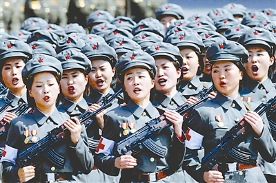 为纪念朝鲜已故领导人金日成诞辰100周年,朝鲜4月15日在首都平壤举行阅兵仪式。朝鲜国家最高领导人金正恩出席阅兵式。图为朝鲜人民军女兵亮相阅兵式。谢涛 供图