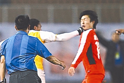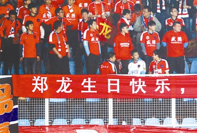 15日,在中超第6轮青岛中能Vs上海申鑫比赛中,中能队的寿星郑龙在比赛中与对手发生冲突,被申鑫队的安东尼奥一拳击中面部(如上图),两人双双被罚下。最终青岛中能2比1获胜。下图为青岛球迷祝郑龙生日快乐。CFP供图