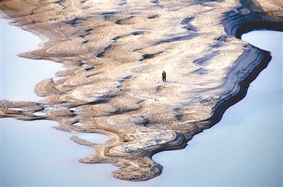湖北十堰市郧县段汉江水位持续下降,江边多处出现裸露的江滩(4月15日摄)。