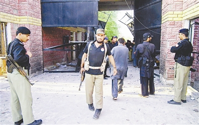 巴基斯坦武装分子15日凌晨对巴基斯坦西北部开伯尔-普什图省本努特区的一座监狱发动袭击,造成384名犯人逃跑。图为巴基斯坦安全人员在该监狱的入口处警戒。吉平 供图