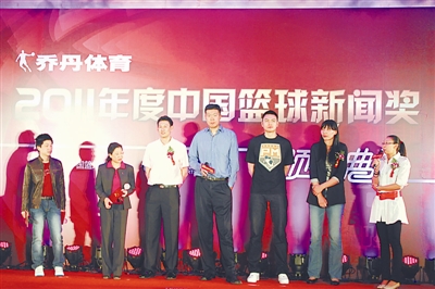 4月16日下午, “乔丹体育2011年度中国篮球新闻奖颁奖典礼” 在北京天坛饭店举行。中国篮协领导与男女篮运动员王治郅、陈楠等出席了颁奖典礼。据悉,本次有25个作品获得2011年度篮球新闻奖。图为篮球运动员与部分获奖者合影。王梦洁 摄